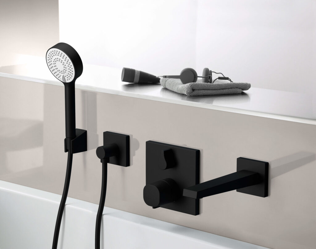 HANSA WANNENSYSTEM (HANSALIVING Wannenarmatur, HANSALOFT Auslauf, HANSABASICJET Brause): Auch für die Wanne bietet die Matt Black Edition formschöne, stylishe Lösungen – als Auf- und Unterputz Varianten. (Foto: Hansa Armaturen GmbH)
